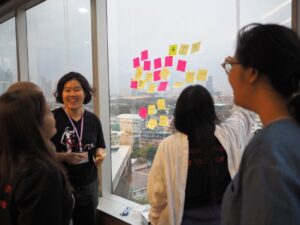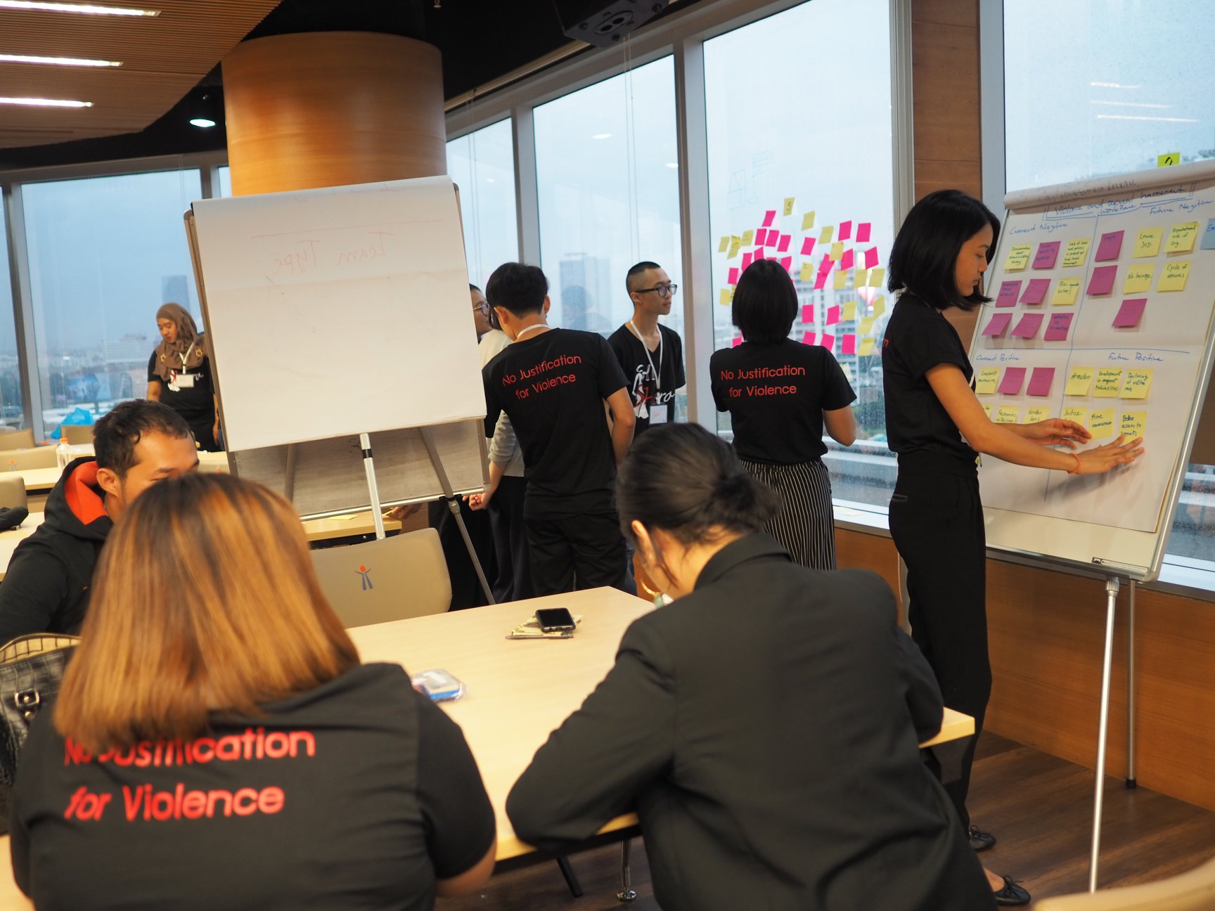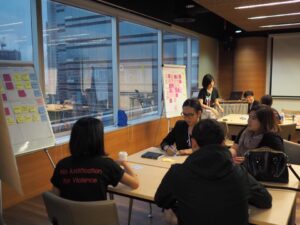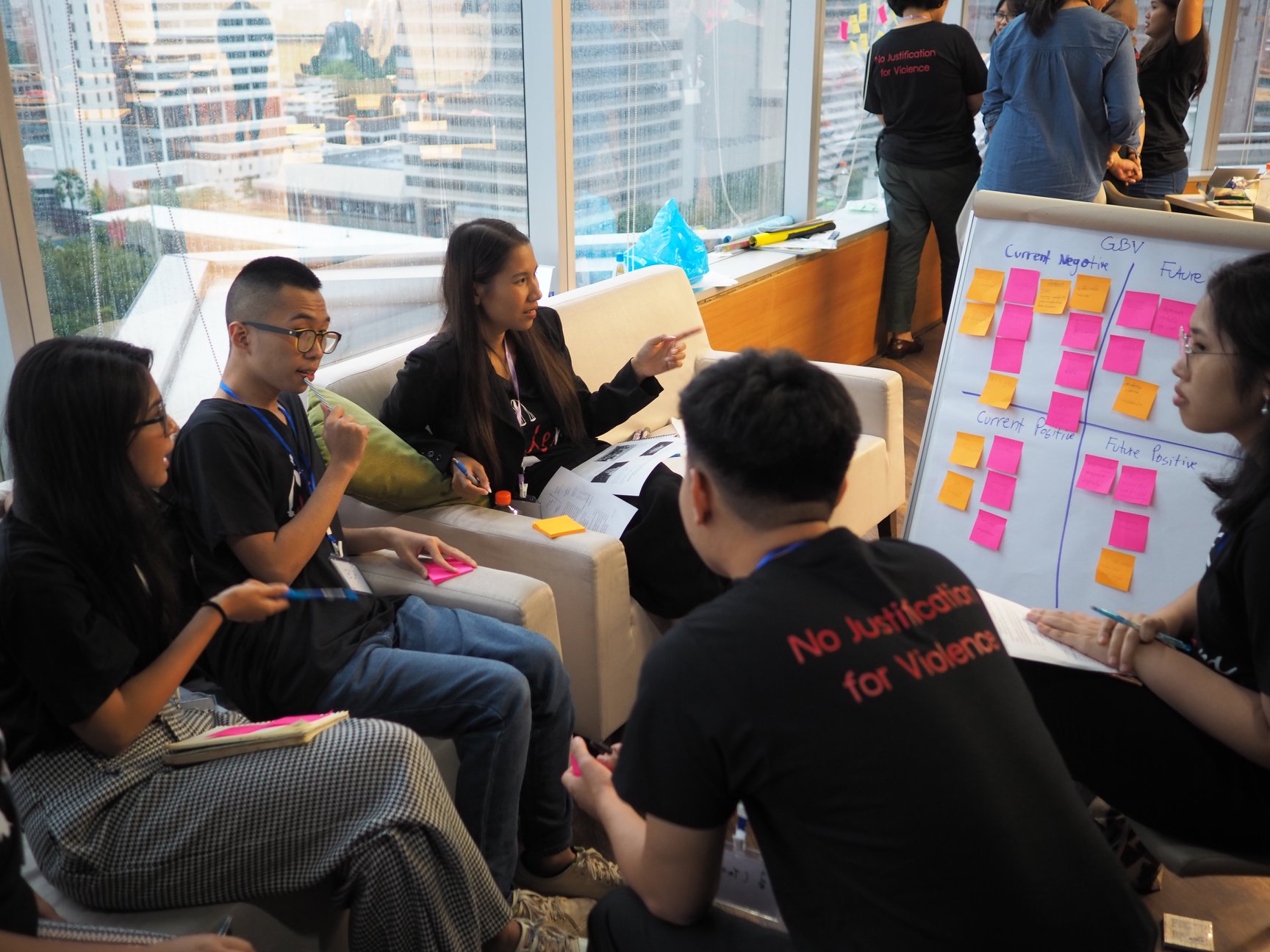 Participants at the SHero Youth Forum are currently taking part in the ‘Design Thinking’ activity they participants create a matrix on a particular aspect of SGBV in order to find and create solutions. They identify current and future negatives and current and future positives related to that aspect of SGBV. This brainstorming activity explores and develops the challenges to solving a particular issue. Then, the challenge is reframed into services, actions and policies that can help solve that particular challenge.
