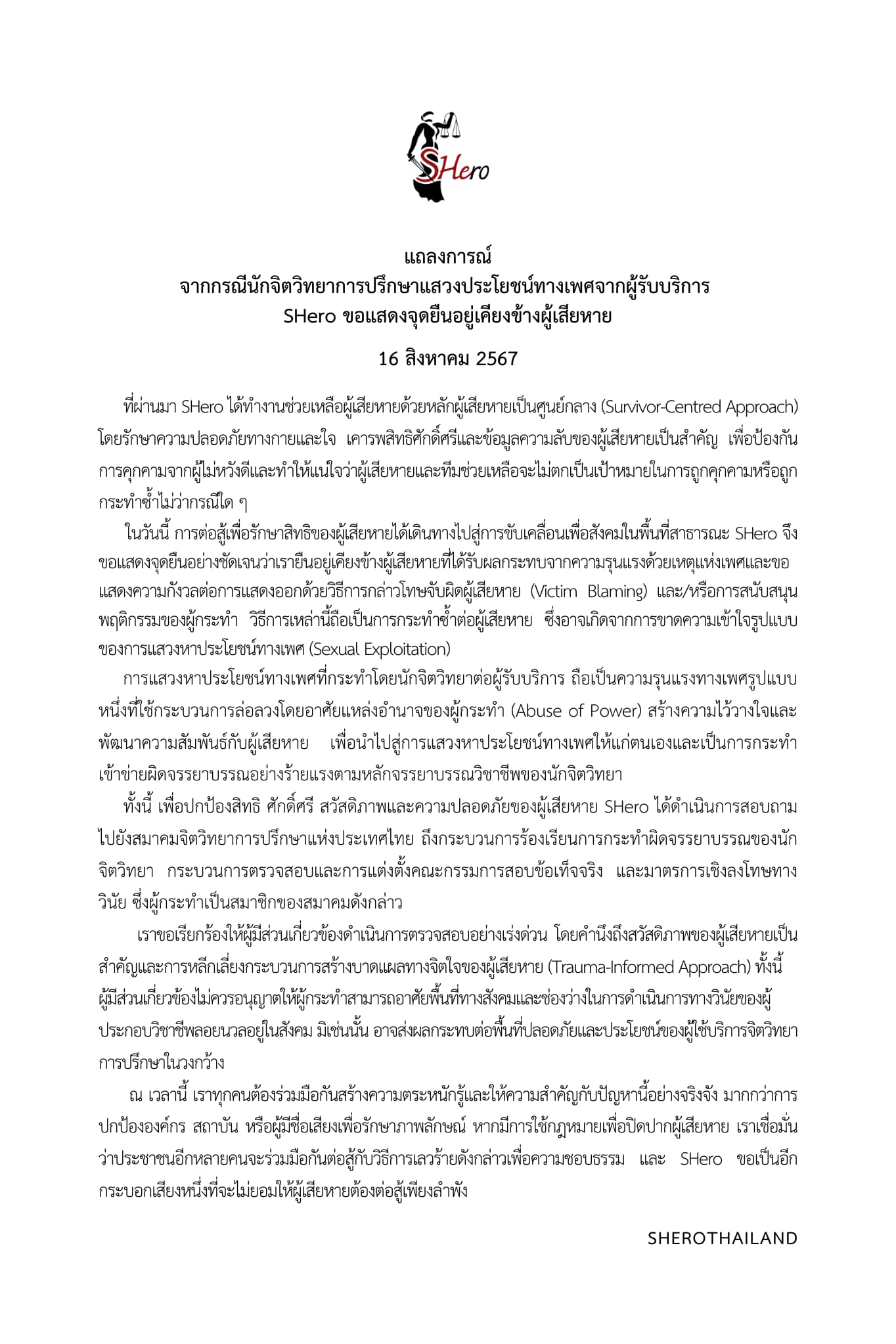 ทั้งนี้ เพื่อปกป้องสิทธิ ศักดิ์ศรี สวัสดิภาพและความปลอดภัยของผู้เสียหาย SHero ได้ดำเนินการสอบถามไปยังสมาคมจิตวิทยาการปรึกษาแห่งประเทศไทย ถึงกระบวนการร้องเรียนการกระทำผิดจรรยาบรรณของนักจิตวิทยา กระบวนการตรวจสอบและการแต่งตั้งคณะกรรมการสอบข้อเท็จจริง และมาตรการเชิงลงโทษทางวินัย ซึ่งผู้กระทำเป็นสมาชิกของสมาคมดังกล่าว